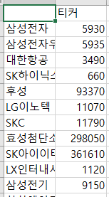 tickerList의 loc를 이용해 원하는 열과 행의 데이터를 찾을 수 있다. 대괄호의 첫번째 데이터는 행에 대한 정보를 두번째 데이터인 'ticker'는 열에대한 데이터를 지정한다. 행과 열을 만족하는 데이터를 찾고 'values'를 이용해 해당 테이블의 변수를 반환한다.
